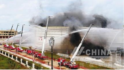 演練災情假設為,海南原油商業(yè)儲備基地1606號罐因浮倉被腐蝕發(fā)生泄漏,罐體遭雷擊,引發(fā)密封圈著火。廠區(qū)值班人員通過“119”報警電話向支隊指揮中心報警。洋浦消防支隊指揮中心接警后,第一時間通過海南省消防圖像綜合管理平臺,調(diào)看了現(xiàn)場的消防和社會監(jiān)控圖像,了解災情后按照五級火警一次性調(diào)集本轄區(qū)滅火、供水、舉高、保障等11個編隊及金海漿紙廠專職消防隊,共31輛消防車趕赴現(xiàn)場,同時通過圖像綜合管理平臺接通省消防總隊請求支援。