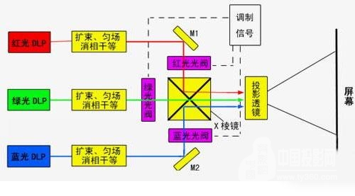 激光全色顯示技術(shù)以紅、綠、藍(lán)激光為光源,其工作原理如圖2,所示:紅、綠、藍(lán)三色激光分別經(jīng)過(guò)擴(kuò)束、勻場(chǎng)、消相干后入射到相對(duì)應(yīng)的光閥上,光閥上加有圖像調(diào)制信號(hào),經(jīng)調(diào)制后的三色激光由X棱鏡合色后入射到投影物鏡,最后經(jīng)投影物鏡投射到屏幕,得到激光顯示圖像。