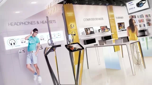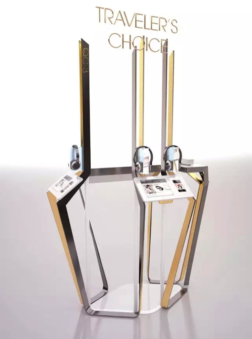 店鋪的布局也遵循了同樣的創(chuàng)意。我們把產品體驗放在中心區(qū)域,四周的墻面作為陳列。“旅行家的選擇”用來重點突出適合旅行的產品。黑色與金色融合的金屬絲帶挑戰(zhàn)了任何現(xiàn)存的聲音產品展示方式。意在用輕盈的展示表達未來感。