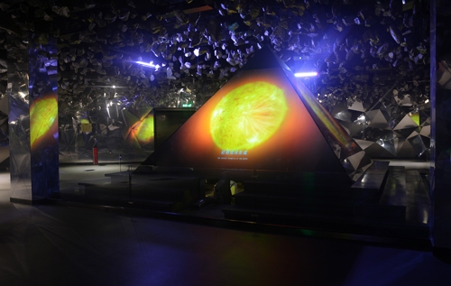 據(jù)現(xiàn)場人員介紹,“宇宙大爆炸”是16臺投影機在背后協(xié)同運作的成果,首先在金字塔的四面,各用3臺投影機進行豎投融合,呈現(xiàn)出立體的光影效果;并在四面塔尖上,每面采用1臺投影機以正投方式投射光影,讓“宇宙大爆炸”效果更逼真。