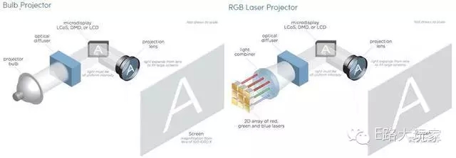 本質(zhì)上,負責產(chǎn)生紅、綠以及藍光的激光器處于“散焦”狀態(tài),填充整個DLP、LCOS或LCD芯片,而不會掃描芯片。從某種角度來說,“激光投影儀”與“LED電視”一樣,在名稱上會給人某種程度的誤解。兩個名詞全都用來描述產(chǎn)生光線的技術(shù),而不是創(chuàng)建圖像的技術(shù),只是一種是激光器,而另一種是發(fā)光二極管。相比之下,“DLP投影儀”以及“LCD 電視”更為準確一些。