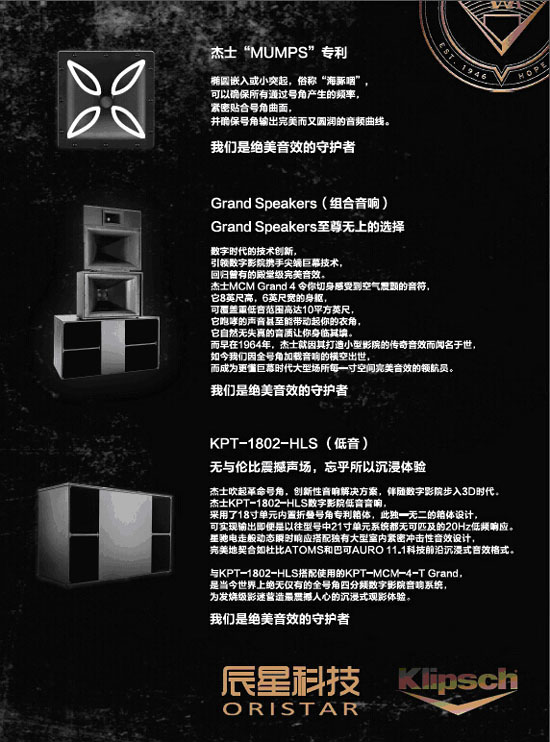 Klipsch在技術(shù)上精益求精,它的產(chǎn)品遍及全球80多個(gè)國家,無論在家庭音響系統(tǒng)、電子領(lǐng)域、還是在專業(yè)的影院、商務(wù)設(shè)備應(yīng)用方面都可以看到Klipsch的產(chǎn)品。2015年,美國杰士音響與辰星公司達(dá)成戰(zhàn)略合作,正式進(jìn)入中國影院市場。選擇辰星科技作為其最大合作伙伴,雙方將共同合力,勢必堅(jiān)定地把國外極具價(jià)值的品牌和產(chǎn)品引進(jìn)中國,惠及中國廣大影迷。
