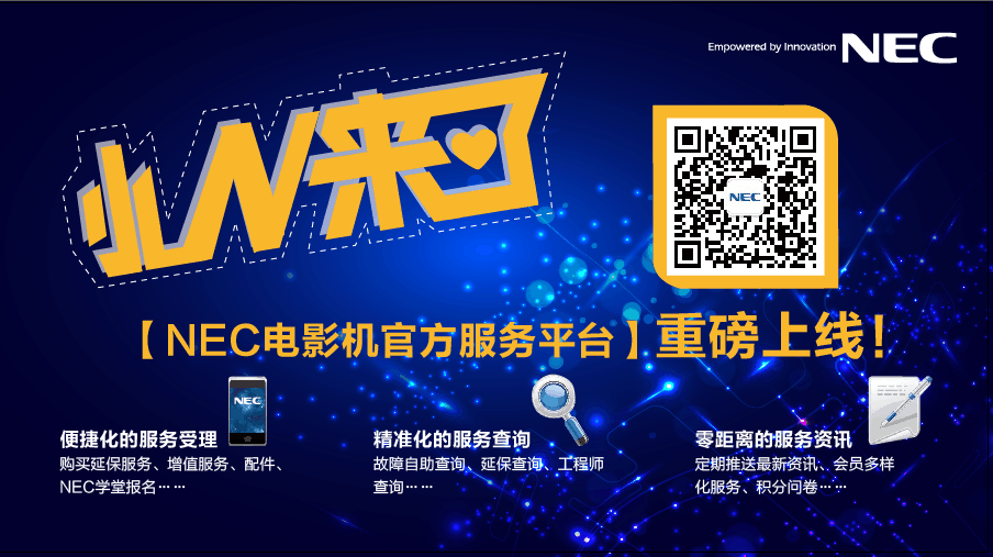 大家是不是都很期待和小N見面了呢?那就快快拿出手機(jī)掃描以下二維碼關(guān)注“NEC 電影機(jī)官方服務(wù)平臺(tái)”吧,小N期待與您見面!
