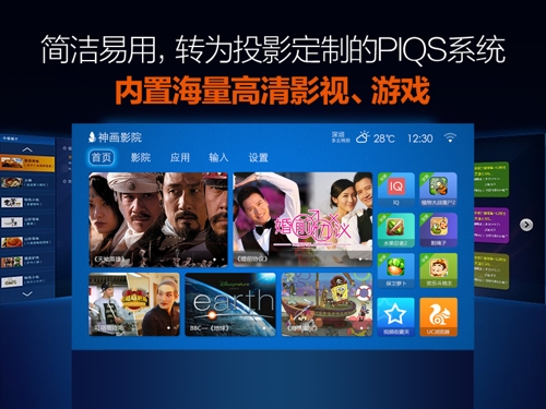 下面我們再來了解一下?lián)碛?00色彩流明值的神畫Y1智能3D投影儀。這款擁有雙鏡頭的3D智能家庭影院配備了包括2秒自動對焦、200吋巨幕投射能力、搭載安卓智能操作系統(tǒng)、配備高性能四核A9處理器、虛擬觸摸遙控器、3D硬件解碼、無線同屏/視頻和PIQS pad版UI八大特色。