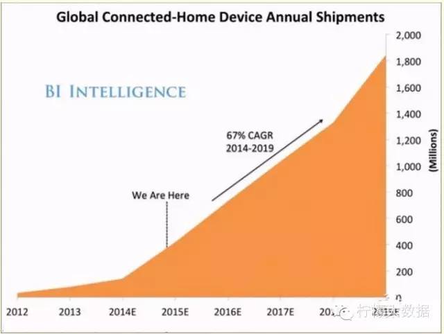 根據(jù)BI分析,2015至2019年間,物聯(lián)化智能家居出貨量的年復(fù)合增長(zhǎng)率(CAGR)將達(dá)67%,預(yù)計(jì)2019年總計(jì)會(huì)有1.8億臺(tái)產(chǎn)品面世,完全刷新了智能手機(jī)和平板創(chuàng)造的超高增長(zhǎng)速度歷史。