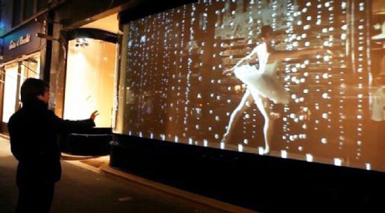 相比傳統(tǒng)的投影機(jī),櫥窗投影一般有兩個(gè)方法,其一是加深櫥窗深度采用吊投,即便如此,投影尺寸也是小的可憐;其二是采用背投方法,但是櫥窗的背面要預(yù)留相當(dāng)面積。兩種方法效果都不是十分理想。