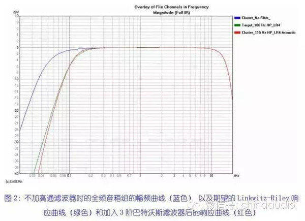 由于超低音音箱在該分頻點(diǎn)附近的響應(yīng)曲線比較平直,所以我們可以直接給它加一個(gè)100Hz的4階L-R低通濾波器。但是,鑒于全頻音箱組的頻響曲線在分頻點(diǎn)附近已經(jīng)出現(xiàn)了衰減我們需要采用低于4階的電子濾波器,從而使全頻音箱組的聲輸出與4階L-R濾波器的100Hz截止頻率fc相匹配。圖2所示的是這組全頻音箱本身的輸出曲線,以及4階L-R高通濾波的期望響應(yīng)曲線。為了達(dá)到該期望響應(yīng)曲線的要求,這里給全頻音箱加了一個(gè)115Hz的3階巴特沃斯高通濾波器。如果需要更加精確地匹配期望響應(yīng)曲線,可以適當(dāng)降低該巴特沃斯濾波器的截止頻率,然后再增加個(gè)參量均衡器進(jìn)行更精確的棱調(diào)?傊,要讓響應(yīng)曲線盡可能貼合我們的期望曲線。