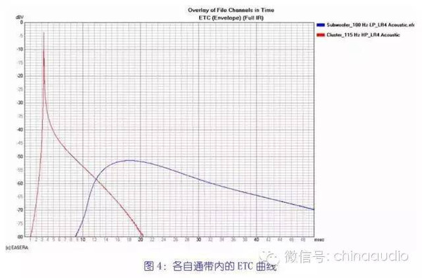 圖3是將高低音音箱輸出合并后的響應(yīng)曲線。此時(shí)總體幅頻響應(yīng)完全不符合要求。很明顯其中存在抵消。我們知道兩組音箱的L-R聲學(xué)響應(yīng)應(yīng)當(dāng)疊加自平直的響應(yīng)曲線。但是這里沒(méi)有,也就是說(shuō)兩組音箱在時(shí)域上存在校準(zhǔn)不當(dāng)?shù)膯?wèn)題。通過(guò)觀察圖4中通帶內(nèi)的能量包絡(luò)曲線(ETC),可以確認(rèn)兩者之間的確存在不同步的問(wèn)題。因此我們需要對(duì)全頻音箱組進(jìn)行延遲,但是延遲量要多大才合適呢?