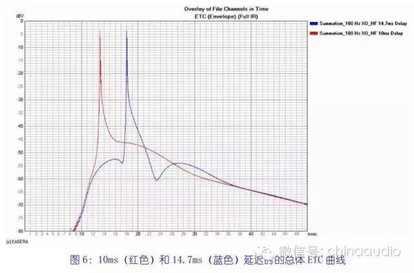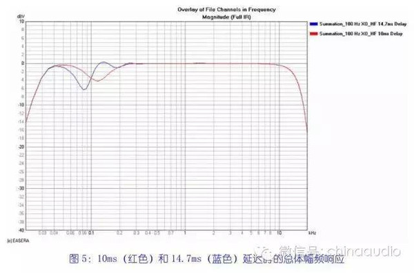 這些濾波器曲線的真實(shí)到達(dá)時(shí)間都是5ms。圖中一個(gè)具有5ms到達(dá)時(shí)間的互補(bǔ)型高通濾波器會(huì)和與之互補(bǔ)的低通濾波器相疊合。如果對(duì)該高通濾波器設(shè)置延遲,使之到達(dá)時(shí)間超過(guò)5ms,那么濾波器疊加后的曲線就會(huì)產(chǎn)生如同圖5和圖6中的問(wèn)題。