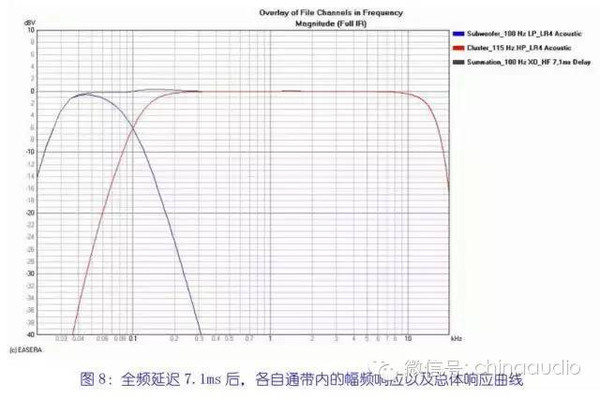 用11.0ms減去3.9ms,就得到了7.1ms的一個(gè)延遲值。按這個(gè)值給全頻設(shè)置延遲,所得結(jié)果見圖8、圖9。這基本上就是我們想要的效果了。圖中在150Hz附近有個(gè)小于0.5dB的偏差。這是因?yàn)楦哳l音箱組的輸出沒(méi)有嚴(yán)格貼合L-R響應(yīng)曲線(參見圖2)的緣故。
