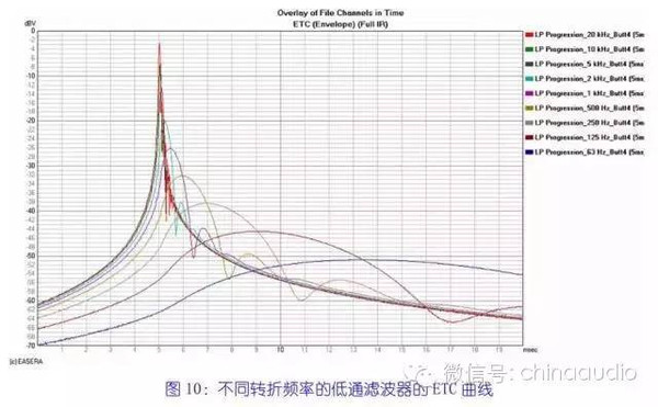 還有一點(diǎn)我覺(jué)得會(huì)有助于了解貌似低通濾波器對(duì)到達(dá)時(shí)間的影響的因素。之所以說(shuō)是“貌似”是因?yàn)檫@種情況只有在到達(dá)時(shí)間發(fā)生變化的時(shí)候才會(huì)出現(xiàn)。圖10和圖11中分別給出了一個(gè)4階巴特沃斯低通濾波器的ETC和脈沖響應(yīng)圖像。這些曲線中的唯區(qū)別在于濾波器的轉(zhuǎn)折頻率(-3dB)處。