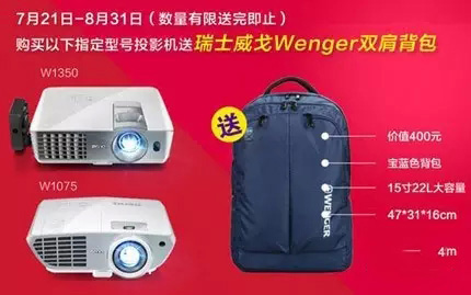 本次明基暑促自7月21日開始至8月31日截止。在此期間,成功搶得W1350或W1075任一款專業(yè)全高清全3D家庭影院投影機(jī),便可贏得寶藍(lán)色15寸瑞士Wenger多功能雙肩背包一個(gè),外觀時(shí)尚有型,超輕透氣防水。
