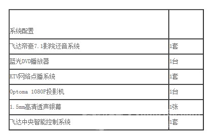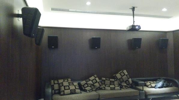 配置了3D的高清投影系統(tǒng),高清電影透聲熒幕,熒幕一側(cè)配置了飛達(dá)(Fidek)左、中、右、超低頻主聲道音箱,后場四只環(huán)繞音箱,對影院系統(tǒng)整體音效進(jìn)行了強(qiáng)化,環(huán)繞效果進(jìn)一步增強(qiáng)。滿足房間的空間太小的需求,使整個音場更連貫。