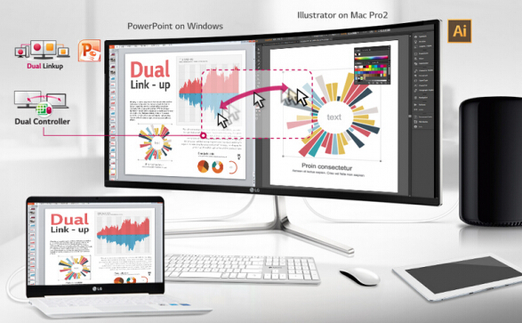 如何提高工作效率?UC97C系列和34UC87C顯示器雙連接特性助力工作事半功倍,兩個(gè)單獨(dú)的設(shè)備以1:1的空間比例連接到顯示器上,允許顯示器劃分為兩個(gè)輸出屏幕。不僅如此,當(dāng)兩個(gè)設(shè)備顯示在一臺(tái)顯示器上時(shí),用戶甚至可以把一臺(tái)設(shè)備中的內(nèi)容融合到另外一臺(tái)設(shè)備中,比如可以一邊PS圖片一邊編輯PPT,隨意切換內(nèi)容。