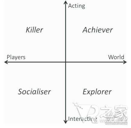 在休閑游戲玩家的范疇里,研究者可以看到四個(gè)象限或“類型”。分別為殺手、成功者、社交者、探險(xiǎn)家。