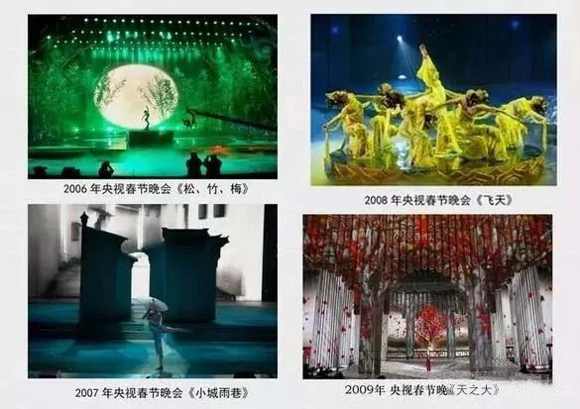 2006年央視春晚舞臺設(shè)計首次運用“水”,借助水幕的磅礴氣勢之美與水上舞臺的溫柔之美形成強烈的對比,營造出一個美輪美奐的水上實景舞臺;2007年央視春晚的舞蹈節(jié)目《小城雨巷》首次將大屏幕的三維虛擬成像影像與實景道具進行了很好的視覺結(jié)合;2008年央視春晚舞美設(shè)計首次采用了“地屏”營造出“人在畫中游”的唯美藝術(shù)表達方式;2009年央視春晚舞美設(shè)計的720根紗筒,結(jié)合著高科技數(shù)字投影燈營造出來的夢幻視覺畫面贏得了億萬觀眾的好評。