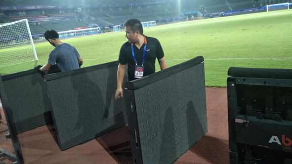 第二天一大早,艾比森工程師與場(chǎng)館人員溝通場(chǎng)地電力安裝問(wèn)題并組織工人們安裝球場(chǎng)賽事LED屏。