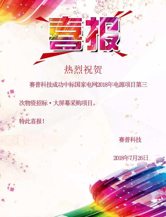 2018年7月,賽普科技參與《國家電網2018年電源項目第三次物資招標·大屏幕采購項目》,經過多番的激烈競爭,最終以良好的信譽、豐富的行業(yè)經驗、強大的技術實力以及優(yōu)秀的方案、合理的報價贏得了招標單位的肯定,順利中標。