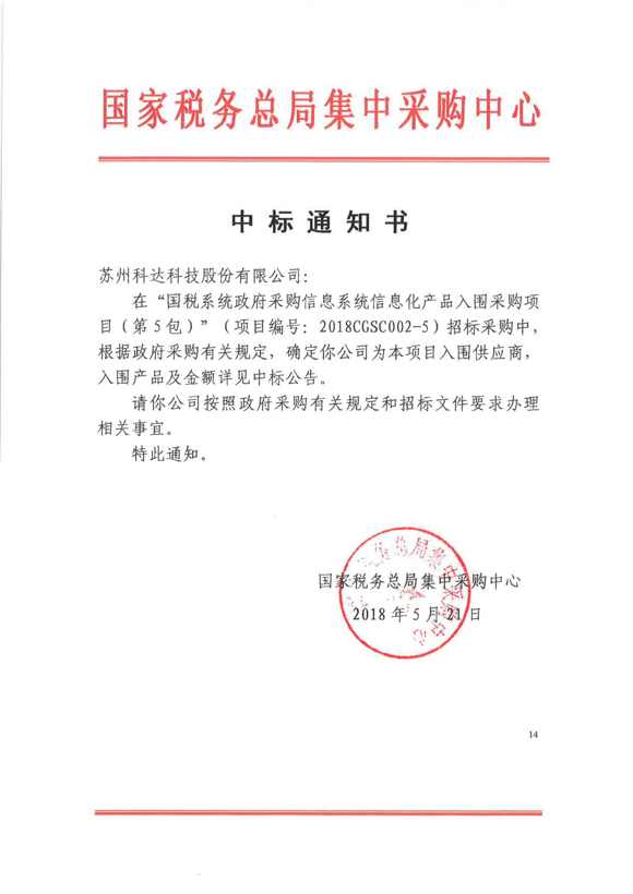 2018年5月,科達(dá)入圍國家稅務(wù)總局國稅系統(tǒng)政府采購信息系統(tǒng)信息化產(chǎn)品采購項(xiàng)目第5包,涉及科達(dá)視頻會(huì)議、視頻監(jiān)控、顯示控制等多個(gè)產(chǎn)品類別。