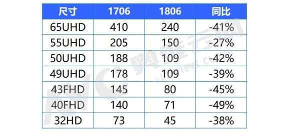 TV面板主要尺寸價(jià)格及同比降幅