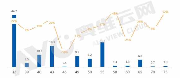 32"出貨量達(dá)到44.7M,同比增長(zhǎng)27%,主要原因是世界杯備貨主要目標(biāo)區(qū)域仍以小尺寸為主,同時(shí)國(guó)內(nèi)市場(chǎng)32"隨著智能化提升降速有所緩解,供應(yīng)端來(lái)看8.6代線爬坡以及8.5代線套切也增加了32"的供應(yīng)。