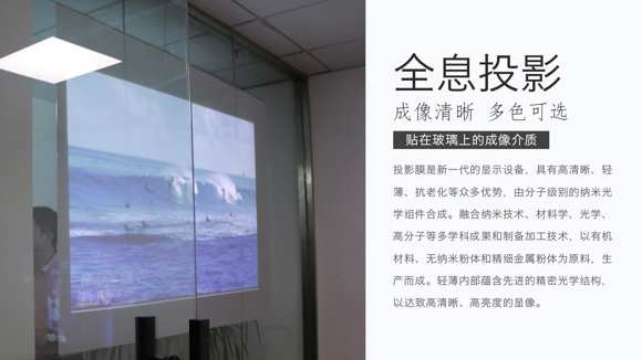 全息膜有四層組成離型膜,膠粘劑,顏色擴(kuò)散層,PET薄膜組成,PET光學(xué)投影膜以平滑的聚PET為材料,由具有擴(kuò)散性的光學(xué)處理層、硬處理層構(gòu)成,可以方便地貼在透明玻璃及亞克力板上使用。讓玻璃成像為現(xiàn)實(shí)。