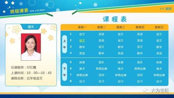 大為世紀(jì)電子班牌擁有專業(yè)性、安全性、交互性和獨(dú)立性的特點(diǎn),其系統(tǒng)功能包括了多媒體展示、教務(wù)信息展示、教務(wù)考勤功能、問卷調(diào)查功能等。根據(jù)學(xué)校的需求,班牌可以展示班級信息、班主任信息、班級宣傳文化、班級活動照片、學(xué)校通知公告,同時可以導(dǎo)入或者對接學(xué)校的教務(wù)系統(tǒng),展示班級當(dāng)日課程表、當(dāng)前課程信息、出勤結(jié)果信息等。