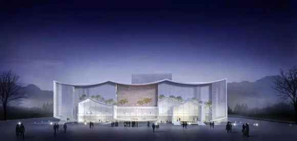 “晚宴劇場”,臨水而建。夜幕降臨后的圓形劇場內,千名觀眾環(huán)繞而坐,飽含原鄉(xiāng)情結的水上舞臺位居正中;首部駐場大戲已敲定越劇《追魚》,演至高潮,劇場內臨湖的“隱形墻”將完全打開,用長達50米的“寬屏實景”將小鎮(zhèn)與剡溪的夜景完美呈現(xiàn),讓每一位觀眾驚艷而難忘。