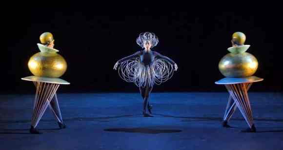 2014年巴伐利亞(慕尼黑)國家芭蕾舞團復排版《三人芭蕾》劇照,圖為《三人芭蕾》之線形舞者和金球舞者