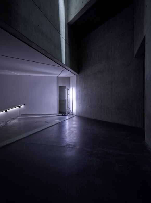 杜塞爾多夫概念藝術(shù)家米舍·庫爾的作品“光與聲:共鳴(Light and Sound:res·o·nant)”,占據(jù)了柏林猶太博物館地下一層占地350平米的空間,包括了兩個垂直的完全空洞的區(qū)域。這兩個留白區(qū)域高度達24米,抬頭可以在看到天花板的玻璃外的天空。藝術(shù)家使用旋轉(zhuǎn)式投影,將燈光投射在墻壁、地面和天花板上來回移動。并通過鏡子的反射和頻閃式光脈沖,創(chuàng)造出明暗的變化。