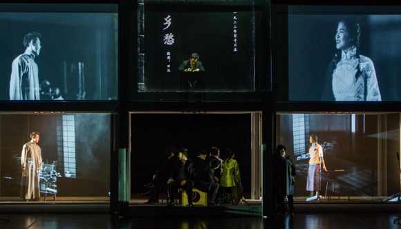 在舞臺上采用多媒體投影,這種做法早已不新鮮。像王翀導(dǎo)演常用的全程拍攝投影,在早年技術(shù)還不成熟時(shí),確實(shí)顯得頗為新潮,但如今很難成為亮點(diǎn)或賣點(diǎn)。影像投影用于營造氣氛或者提供視覺信息,但相對于《劇院魅影》舞臺設(shè)計(jì)的巧思或《獅子王》的古樸,則往往顯得缺乏創(chuàng)意,甚至被歸為濫用高科技。在這方面,田沁鑫導(dǎo)演的《狂飆》可謂揚(yáng)長避短,把影像用得恰到好處,畫龍點(diǎn)睛。六臺攝影機(jī),通過無線信號傳輸,拍攝并投射六個(gè)盒子式空間以及盒子前方表演區(qū),著重于戲中戲的展示,巧妙地演繹了田漢的創(chuàng)作。很多流水賬式的信息,借助投影便不再顯得枯燥。跟《影子》相比,《狂飆》的影像并沒有搶舞臺的戲,而是有效豐富了舞臺的魅力。