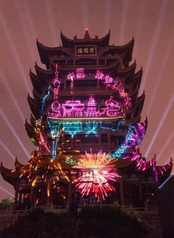 紅、藍(lán)、黃三色彩燈,配合主題燈光秀。將夜色中的黃鶴樓,烘托得美輪美奐。歐盟成員國(guó)代表及上合組織成員國(guó)代表共同見(jiàn)證這一盛事。
