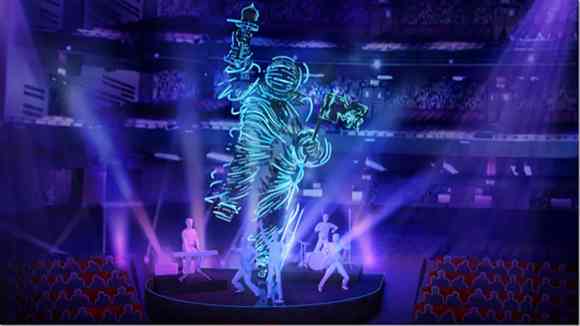 其中包含LED霓虹燈繩索的Moon Man的第二階段也是一個(gè)非?岬臉(biāo)志性設(shè)計(jì),頒獎(jiǎng)典禮來到紐約,就通過Moon Man(這是一個(gè)標(biāo)志性的VMA視覺識(shí)別身份)與自由女神像結(jié)合起來創(chuàng)造出專屬于紐約這場(chǎng)舞臺(tái)的月亮人物來慶祝這個(gè)盛典。這個(gè)設(shè)計(jì)也令設(shè)計(jì)團(tuán)隊(duì)興奮不已,特別創(chuàng)造的Moon Man為舞臺(tái)的集合創(chuàng)造了專屬背景。