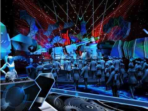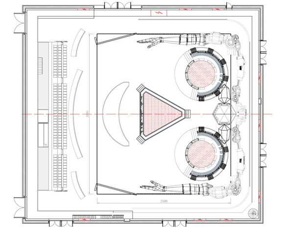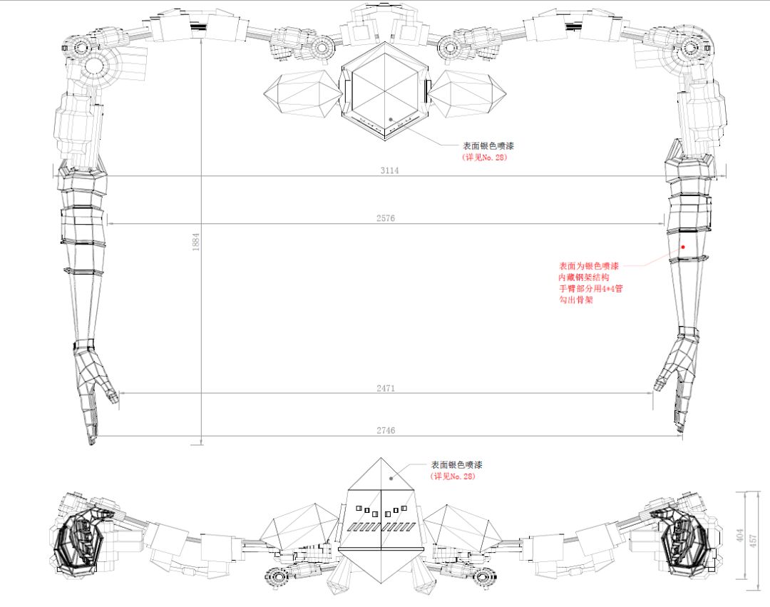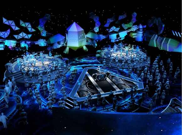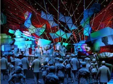 作為一檔貼近年輕群體的音樂節(jié)目,舞美整體設(shè)計偏向年輕化又極具科技感。兩個樂隊在對稱方向的“飛碟”上進(jìn)行表演,中間設(shè)有可供表演的三角形嘉賓區(qū),弧形的評論區(qū)結(jié)合演播廳兩側(cè)的機(jī)械臂膀,最終形成未來感十足的機(jī)器人造型。