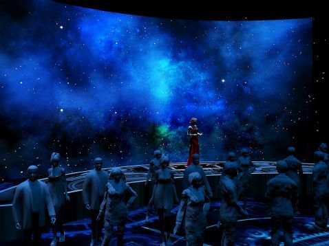 《超級樂隊》的舞臺強(qiáng)調(diào)視覺張力,同時要貼合搖滾樂隊的獨(dú)立自由精神,因此利用主屏幕影像與地屏共同造型,側(cè)面吊掛景片屏幕,進(jìn)行了影像的延展,輔以有節(jié)奏變幻的燈光,充分地拓展了太空的自由概念,在演播廳里渲染出星際的浩瀚神秘,寓示著不論是樂隊還是觀眾都可以在這無邊界的音樂世界中自由穿梭,踏上一個愉悅美妙的音樂旅程。