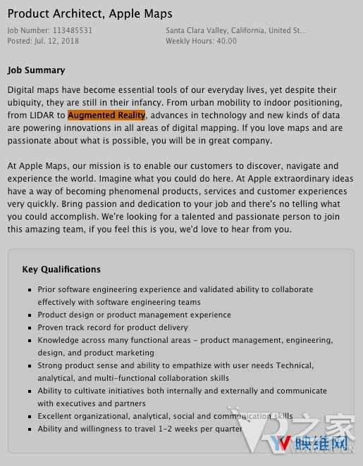 至于蘋果AR團(tuán)隊(duì)希望研發(fā)的應(yīng)用程序,今年夏天的招聘其實(shí)為我們提供了一定的線索:蘋果地圖產(chǎn)品有望成為首批成果。在7月,映維網(wǎng)發(fā)現(xiàn)蘋果地圖團(tuán)隊(duì)正在招募產(chǎn)品架構(gòu)師,職位要求如下: