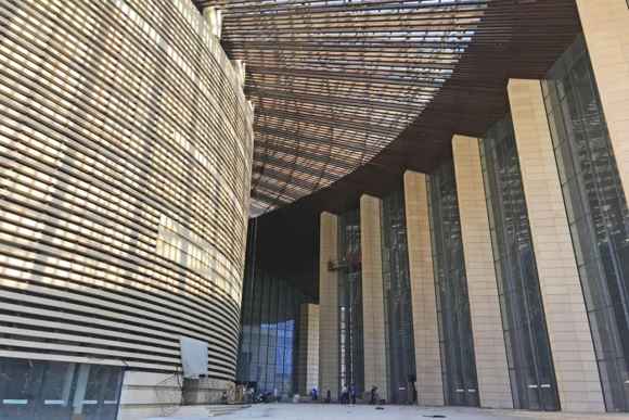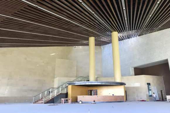 走進大劇院,內部裝修已經(jīng)基本完成。明亮的大理石地面,鑲嵌了眾多壁燈的走廊,給人極大氣的感覺。“整個大劇院地上有四層,地下有三層,總高59.65米。”工作人員介紹,隨著裝修工作進入尾聲,大劇院投用的日期越來越近。