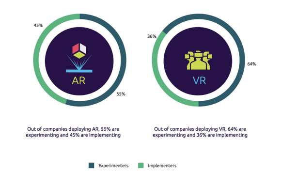 凱捷的研究報告顯示,在接下來幾年里企業(yè)將會大批量采用AR/VR技術(shù),沒有使用這兩項技術(shù)的企業(yè)競爭力相對較低。報告中的一個重點是,雖然企業(yè)對VR進(jìn)行的實驗比AR多,但是對AR進(jìn)行應(yīng)用的企業(yè)更多。接觸VR的企業(yè)中有64%在對這項技術(shù)進(jìn)行實驗,而應(yīng)用VR的企業(yè)占36%,而實驗AR技術(shù)的企業(yè)有55%,應(yīng)用的企業(yè)占45%。