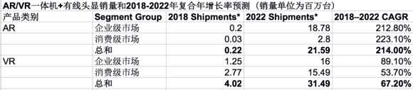 報告中稱,AR和VR一體機和有線頭顯全球銷量到2018年預(yù)計達(dá)420萬臺,與2017年相比提高31%。到2022年,銷量將增加到5310萬臺,復(fù)合年增長率(CAGR)達(dá)88%。雖然目前眼鏡盒子占了大部分頭顯市場,但是在2018到2022年之間銷量會下降,復(fù)合年增長率降為-1%(不過外媒對此有所懷疑,畢竟三星為了宣傳Galaxy手機一直在免費贈送頭顯盒子)。