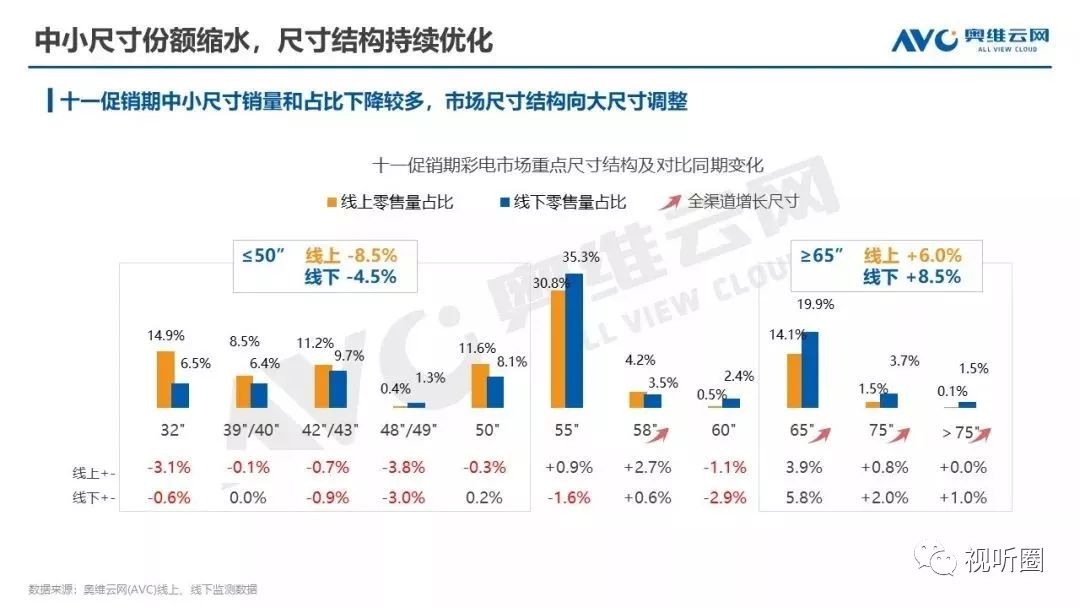 在剛剛過(guò)去的Q3中小尺寸彩電市場(chǎng)萎縮,50英寸成為傳統(tǒng)分界線:50寸以下線上與線下市場(chǎng)零售量占分別下滑5.5%和7.1%,尺寸價(jià)格上亦呈現(xiàn)連續(xù)下滑態(tài)勢(shì)。而50寸以上電視的需求,在不斷提升,尤其是在65寸及以上“大屏電視”則繼續(xù)“飆升”。其中65寸線上達(dá)到12.6%,線下達(dá)到15.8%,而另一個(gè)大屏電視主打尺寸75寸也在積極“上漲”,線上和線下占比差不多超過(guò)1%。