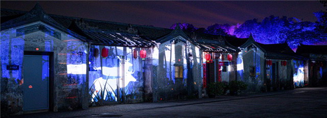 作為這個(gè)古村落的標(biāo)志性建筑的碉樓,在夜色中舊貌換新顏,兼具歷史滄桑感和現(xiàn)代摩登氣息的畫面通過兩臺(tái)科視Christie Crimson WU30激光投影機(jī)精準(zhǔn)呈現(xiàn),在流動(dòng)的光影中靜靜訴說(shuō)著客家人艱苦奮斗、保護(hù)家園的歷史。