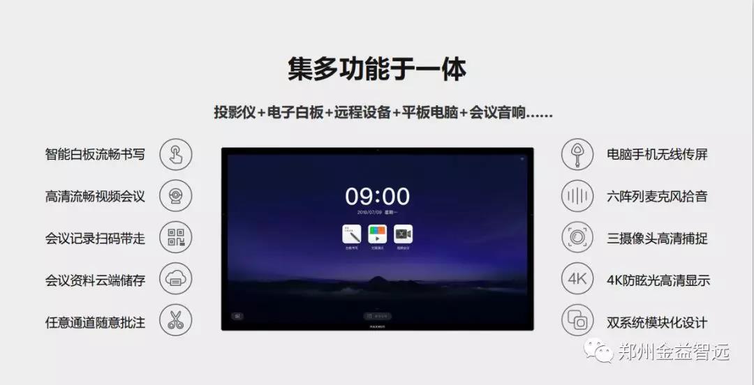 會(huì)議每時(shí)每刻都在發(fā)生,人們通過會(huì)議交流信息、達(dá)成共識(shí)、協(xié)同共創(chuàng)。會(huì)議是昂貴的商業(yè)行為,設(shè)備、人員、時(shí)間無一不是成本。在早期的會(huì)議室里,顯示昏暗的幕布,混亂不堪的線材,以及設(shè)備調(diào)試等待的時(shí)間,讓我們感到會(huì)議效率被大大降低了。我們?cè)O(shè)想,在企業(yè)會(huì)議室里,應(yīng)該有一面清晰的會(huì)議屏,在上面書寫沒有空間限制,設(shè)備可以無線連接,會(huì)議不再需要人工記錄,無論我們?cè)谀睦,都能和業(yè)務(wù)伙伴身臨其境地溝通。
