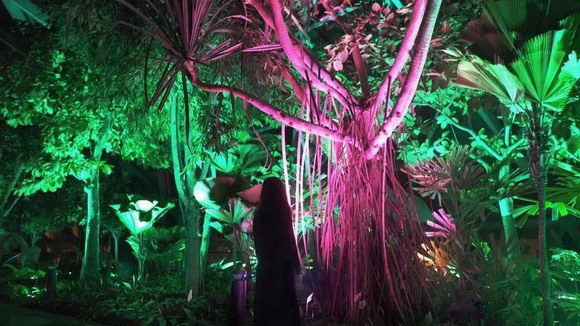 每棵樹都配有獨立的光源,在夜色中忽明忽暗的閃光,宛如綠色植物在盡情的呼吸。這場展覽讓游客與自然進(jìn)行一場親密的互動,植物通過感應(yīng)經(jīng)過的人們,逐漸變化其燈光的顏色,像是在訴說自己的故事,用獨特的語言對經(jīng)過的朋友打招呼,觀眾仿佛融入了整片森林。