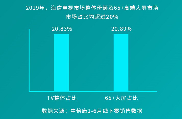 從市場份額來看,中怡康線下彩電市場監(jiān)測數(shù)據(jù)顯示,2019年1-6月,海信電視零售額占比為20.83%,65+高端大屏占比20.89%,無論是整體規(guī)模還是高端份額均位居第一,牢牢占據(jù)著中國第一高端電視品牌的位置。