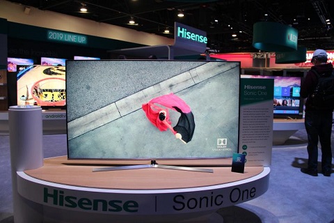2019年CES展的海信展臺(tái),一臺(tái)65吋的Sonic-one液晶電視因?yàn)槌跸胂蟮谋『统驳脑O(shè)計(jì)吸引了很多參展者。