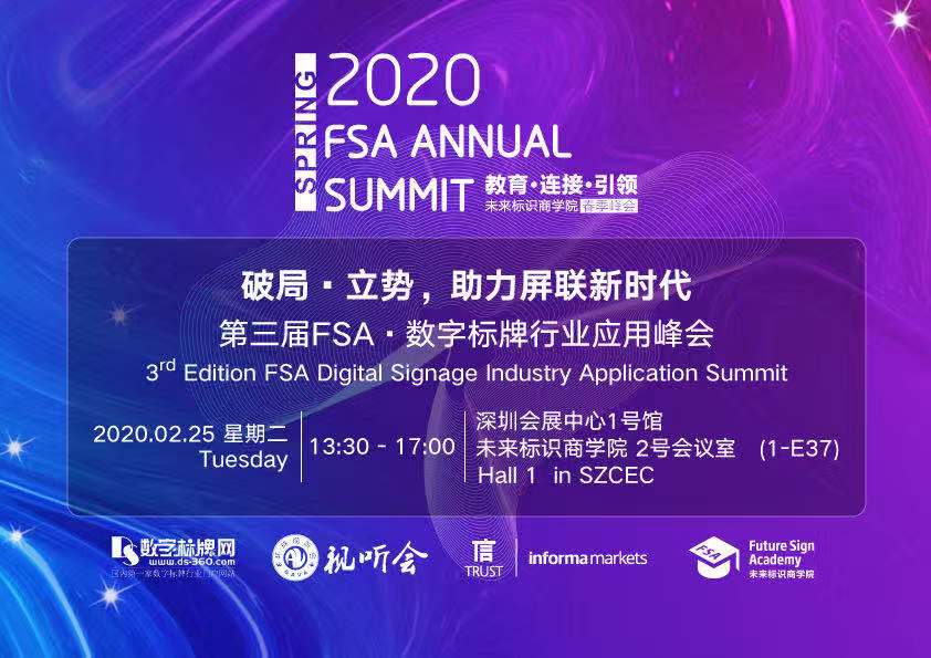 2020年2月25日下午,數(shù)字標(biāo)牌網(wǎng)與聞信合作的第三屆FSA數(shù)字標(biāo)牌行業(yè)峰會(huì)以“破局·立勢,助力屏聯(lián)新時(shí)代”為主題,探討數(shù)字標(biāo)牌、商用顯示的進(jìn)一步發(fā)展,將在深圳會(huì)展中心1號館的未來標(biāo)識商學(xué)院2號會(huì)議室召開。會(huì)議將邀請?zhí)堉秋@科技(深圳)有限公司總經(jīng)理郝光軍先生出席現(xiàn)場并作主題分享,太龍智顯作為專業(yè)的LED智慧終端提供商將與現(xiàn)場參會(huì)嘉賓一起展現(xiàn)新動(dòng)態(tài),了解行業(yè)大勢,探討行業(yè)發(fā)展,探索未來智慧城市的發(fā)展趨勢。LED數(shù)字標(biāo)牌邁向智能化已經(jīng)是大勢所趨,隨著智慧城市建設(shè)的進(jìn)一步推進(jìn),未來用戶將會(huì)有更多、更新的需求出現(xiàn),我們誠摯邀請行業(yè)朋友共同參與、共同探討。
