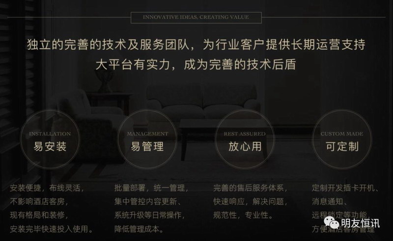 從智能影音硬件、影視內(nèi)容供應、酒店管理系統(tǒng)定制、對接、顧客服務平臺構(gòu)建,為各行業(yè)客戶提供全方位、一站式的品質(zhì)服務。