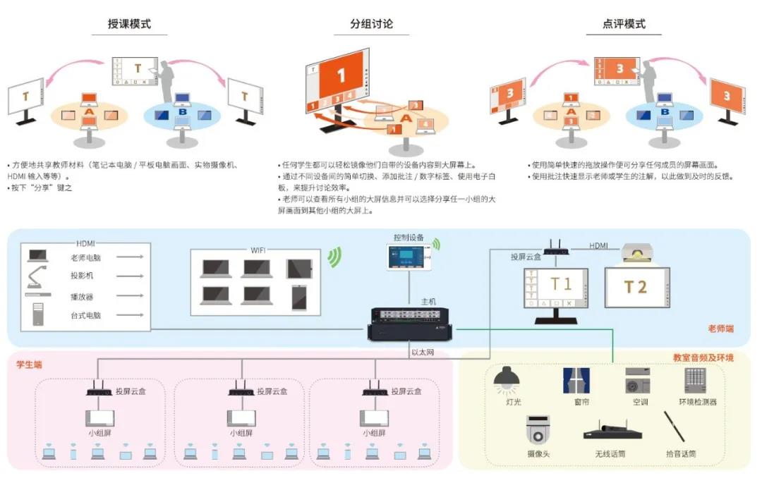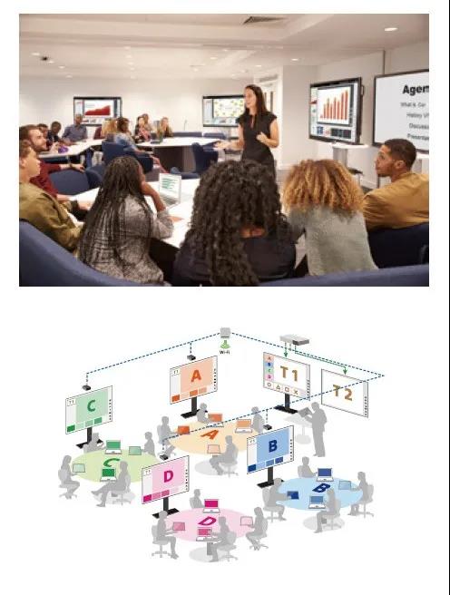 這一教室模式的最大特點是可以任意組織課堂形態(tài)、方便信息共享,組團之間、學生之間、師生之間的屏幕均可以任意切換,可以交互點評,有效提高教學效率。