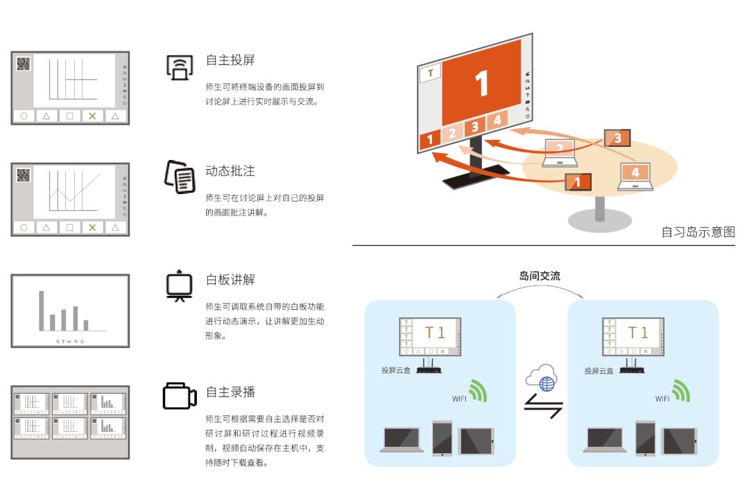 這方面,艾維創(chuàng)在疫情爆發(fā)之初便引發(fā)深刻思考,組織研發(fā)部門探索更優(yōu)的智慧教學模式,在原有演示型、互動型和遠程互聯(lián)互通型智慧教室的基礎上著重深化自習島的教學模式,最大化自主學習、小組學習和精品學習的可能,努力弱化大班教學,盡量避免過多的人員聚集,杜絕因此帶來的不可控安全問題。