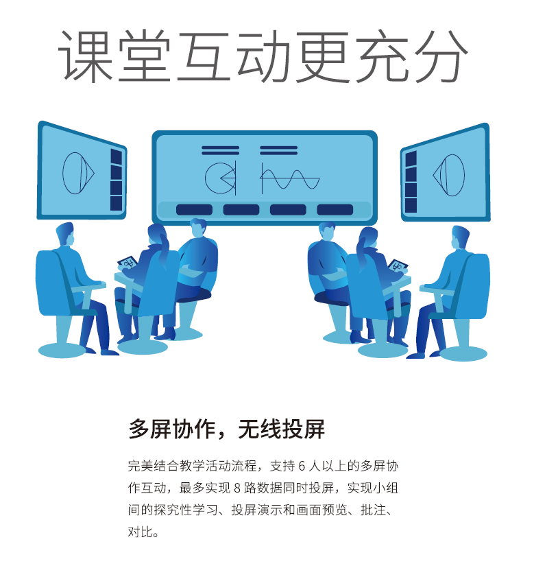 互動型智慧教室將學生、講師和演講者凝聚在一起,打造出動態(tài)的工作組環(huán)境。通過分享每一個人的多媒體演示內容,讓團隊成員、講師和演講者可以更深入的交流,相互協(xié)作。如果需要,甚至可以將遠程參與者納入討論當中。